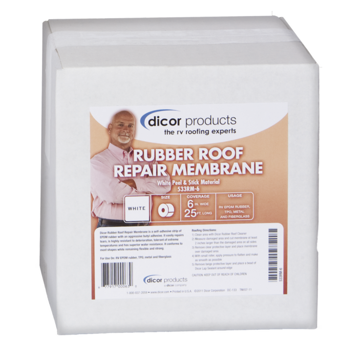 Dicor’s Rubber Roof Repair Membranes are self-adhesive strips of EPDM rubber that repairs tears, is highly resistant to deterioration and has superior water resistance. Plus, it contains no asphalt, solvent of VOCs, making it environmentally friendly.