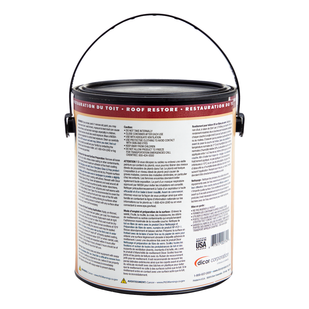 Directions For Use and Surface Preparation:Remove all loose dirt, oil, rust, chalk, mildew, loose coating or other contaminants, which would prevent maximum adhesion of the fresh coating. Clean fiberglass roof with Dicor Fiberglass Clean & Prep product number RP-FCP-1. Rinse thoroughly and let dry. Prepare surface by rubbing with fine steel wool or sandpaper to provide a slightly abraded surface to which coating will adhere. Rewash with Dicor Fiberglass Clean & Prep. Cover all joints and roof seams with Dicor Coating Ready Cover Tape.