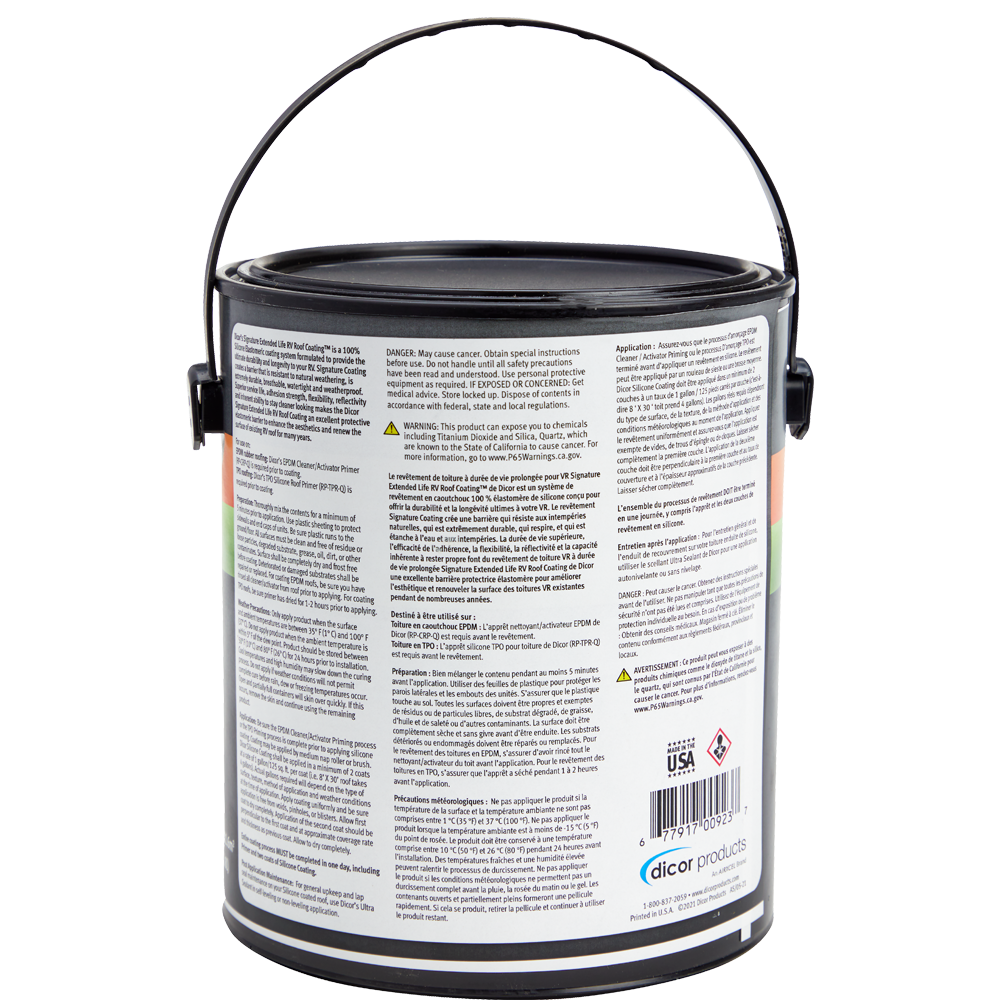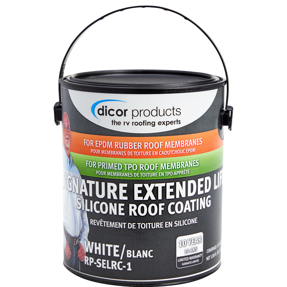 Dicor’s Signature Extended Life RV Roof Coating is a 100% Silicone Elastomeric coating system formulated to provide the ultimate durability and longevity to your RV. Signature Coating creates a barrier that is resistant to natural weathering, is extremely durable, breathable, watertight and weatherproof. Superior service life, adhesion strength, flexibility, reflectivity and inherent ability to stay cleaner looking makes the Dicor Signature Extended Life RV Roof Coating an excellent protective elastomeric barrier to enhance the aesthetics and renew the surface of existing RV roofs for many years.